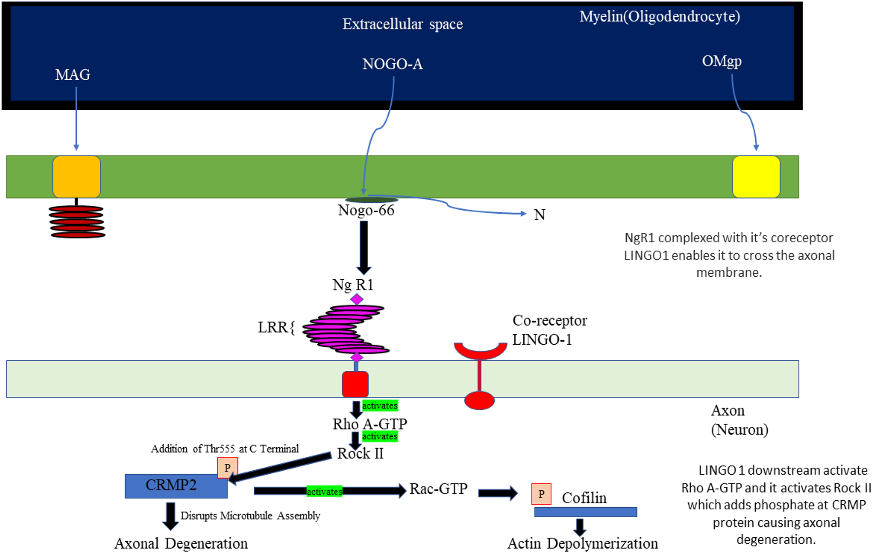 LINGO-1是髓鞘形成的一个必需的负调控因子。它通过与NgR1/Nogo-66(配体结合亚基)和p75(信号转导亚基)形成的三元复合物抑制轴突再生。NgR1依赖其共受体进行跨膜信号传导。三种主要的髓鞘相关抑制因子是Nogo、少突胶质细胞髓鞘糖蛋白和髓鞘相关糖蛋白,它们都共享这个三分子受体复合物。抑制作用是通过RhoA-GTP在中枢神经系统中存在MOG、MAG或Nogo-66时的上调来实现的。