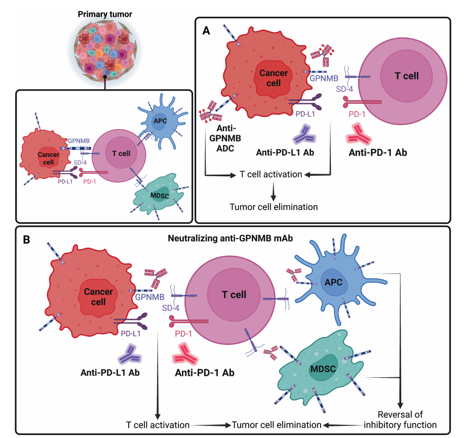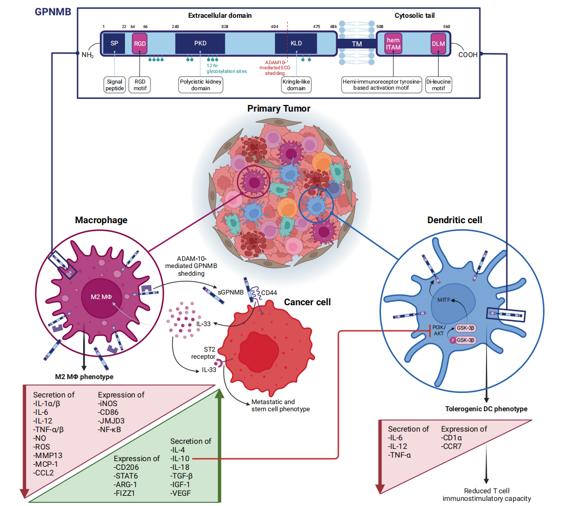 GPNMB促进巨噬细胞极化为M2表型,其特征为抗炎免疫介质的表达/分泌增加以及促炎免疫介质的表达/分泌减少。GPNMB还诱导树突状细胞产生耐受性表型,其特征为促炎免疫介质的表达/分泌减少。这最终导致免疫抑制性肿瘤微环境的形成。