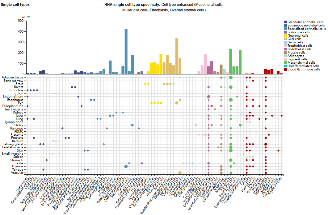 HTRA1主要表达在间皮细胞,Muller细胞,成纤维细胞,卵巢基质细胞中。在巨噬细胞,Hofbauer细胞,Kupffer细胞,朗格汉斯细胞,红系细胞等免疫细胞中有少量表达。