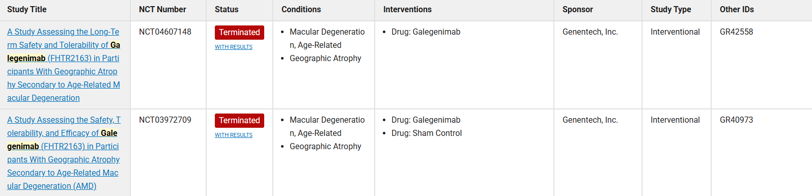 NCT03972709是一项评估Galegenimab在年龄相关性黄斑变性(AMD)继发性地理萎缩患者中的安全性、耐受性和疗效的研究(GALLEGO)。研究发现治疗组和假手术组之间的差异没有统计学意义。接受治疗的患者眼内炎症发生率很高(7.1%,16/224名患者)。DMC建议根据早期获益/风险分析提前终止研究。